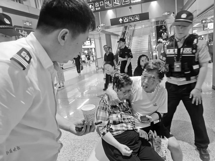 车站工作人员及驻站公安协力救助晕倒乘客。