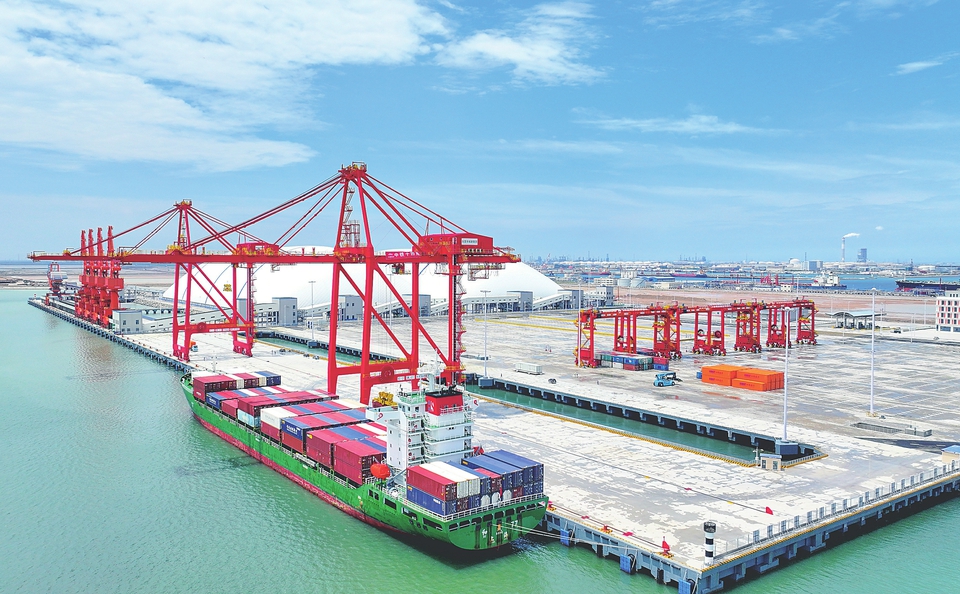 7月2日,集装箱船舶靠泊在东营港一突堤集装箱码头(无人机照片)。