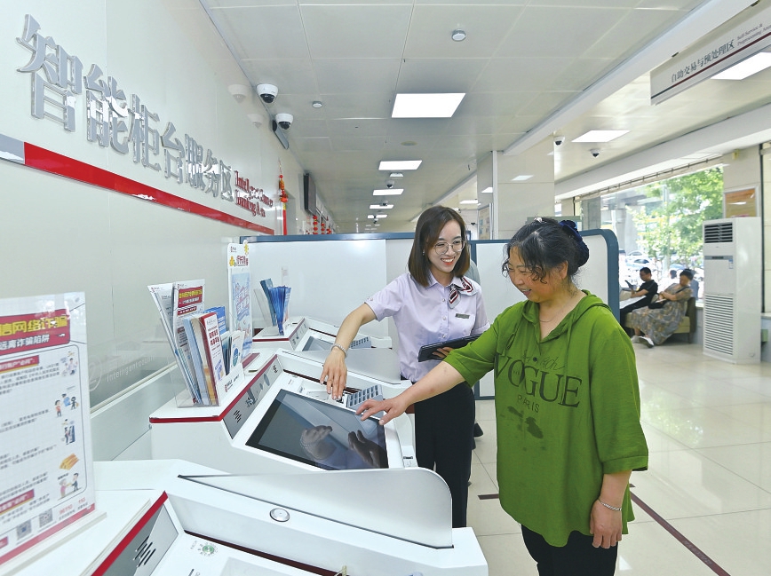 7月10日,中国银行太原双塔东街支行工作人员在智能柜台服务区帮助客户进行金融服务。本报记者王瑞瑞摄