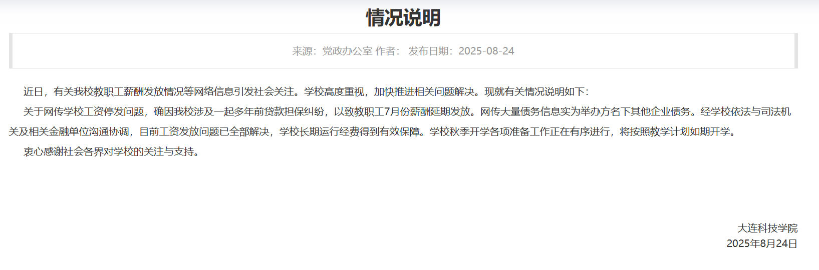 中新网8月25日电 据大连科技学院网站消息,近日,有关大连科技学院教职工薪酬发放情况等网络信息引发社会关注。8月24日,大连科技学院发布情况说明,关于网传学校工资停发问题,确因我校涉及一起多年前贷款担保纠纷,以致教职工7月份薪酬延期发放。