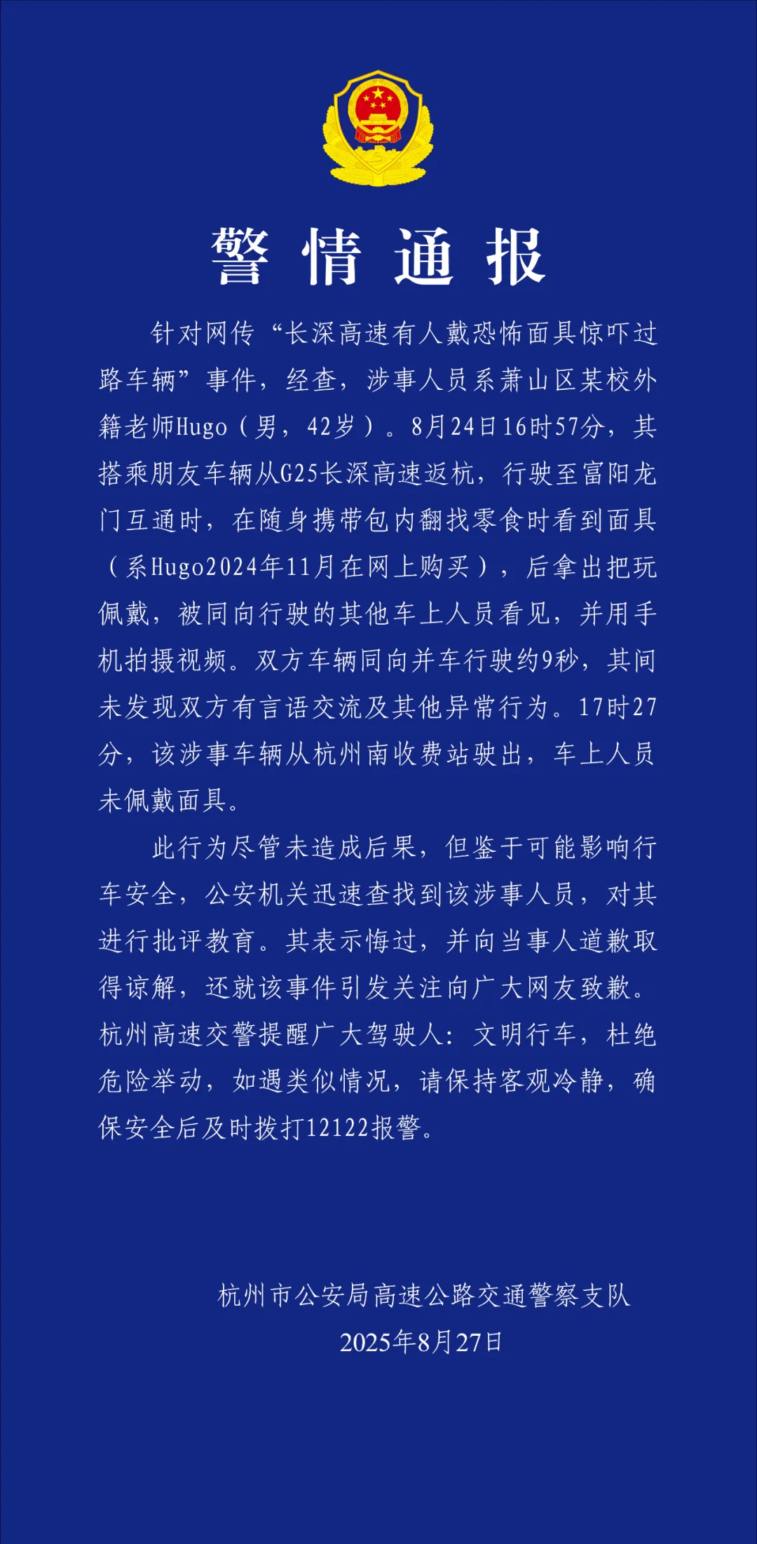 中新网8月27日电 据杭州高速交警微信公众号消息,8月27日,杭州市公安局高速公路交通警察支队发布警情通报,针对网传“长深高速有人戴恐怖面具惊吓过路车辆”事件,经查,涉事人员系萧山区某校外籍老师Hugo(男,42岁)。8月24日16时57分,其搭乘朋友车辆从G25长深高速返杭,行驶至富阳龙门互通时,在随身携带包内翻找零食时看到面具(系Hugo2024年11月在网上购买),后拿出把玩佩戴,被同向行驶的其他车上人员看见,并用手机拍摄视频。