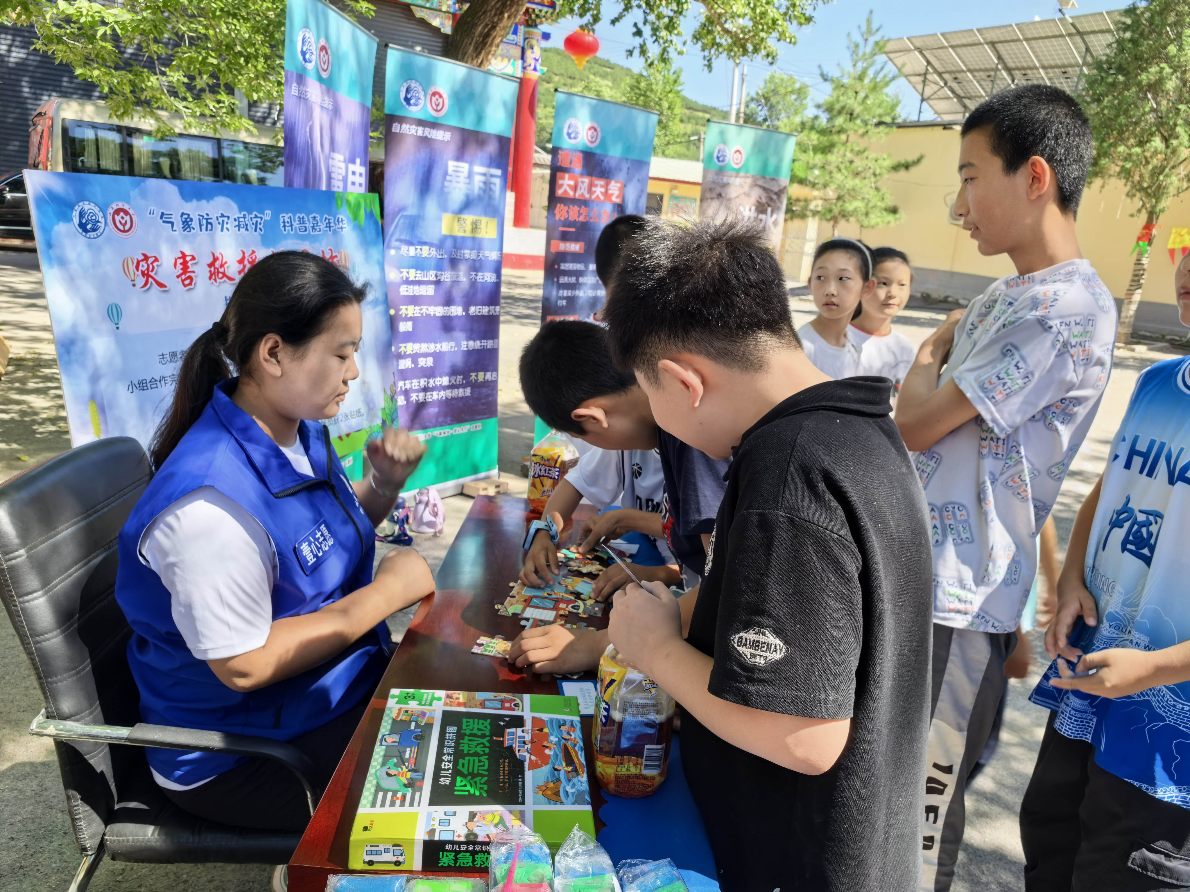 期间,志愿队在潘家庄村文化广场举办了 “气象防灾 安全‘童’行”气象防灾减灾科普嘉年华活动。活动设置了“气象科普小卫士”知识速答站、“灾害救援” 拼图坊、“气象知识我会猜”风云灯谜会三大互动体验区域。小朋友们热情参与知识快问快答,通过贴纸激励强化防灾知识记忆;分组协作完成灾害场景拼图,深化对防汛减灾力量的认识;在灯谜会上,孩子们通过猜谜轻松掌握了雨、露、雷等基础气象常识。