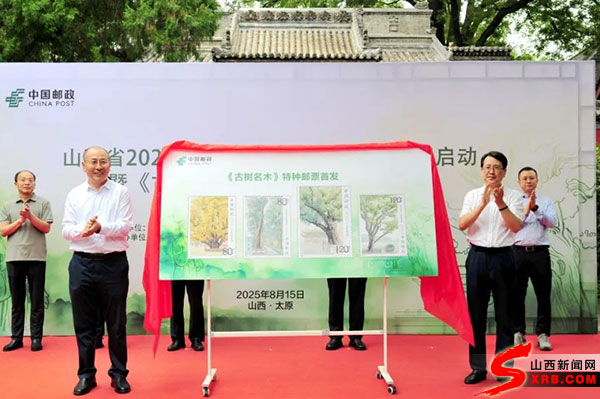随后,山西省2025年古树名木保护科普宣传周启动仪式暨《古树名木》特种邮票首发仪式在晋祠博物馆举行。活动旨在向全社会倡议,号召共同守护三晋绿色瑰宝,赓续千年文明根脉,宣传古树名木的重要价值和保护意义,深入挖掘其承载的历史文化内涵。仪式上,为中国邮政当日发行的《古树名木》特种邮票进行了揭幕。