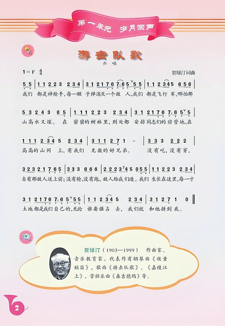 1943年《游击队歌》在延安演出,毛泽东主席称赞歌曲写得好。贺绿汀曾任华北文工团团长、中央音乐学院副院长等职。