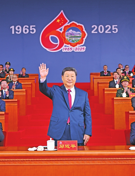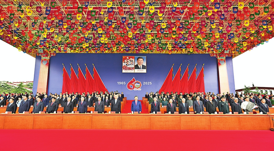 王沪宁发表讲话。他说,1965年9月,在党中央亲切关怀和党的民族政策光辉照耀下,西藏自治区宣告成立。这是西藏发展史上具有划时代意义的大事,巩固了西藏和平解放和民主改革的伟大成果,实现了西藏社会制度的历史性跨越。60年来,西藏经济社会全面发展,民族区域自治制度成功实践,民族团结日益巩固,各族人民生活蒸蒸日上,充分展现了中国共产党领导的坚强力量,充分展现了我国社会主义制度的显著政治优势。